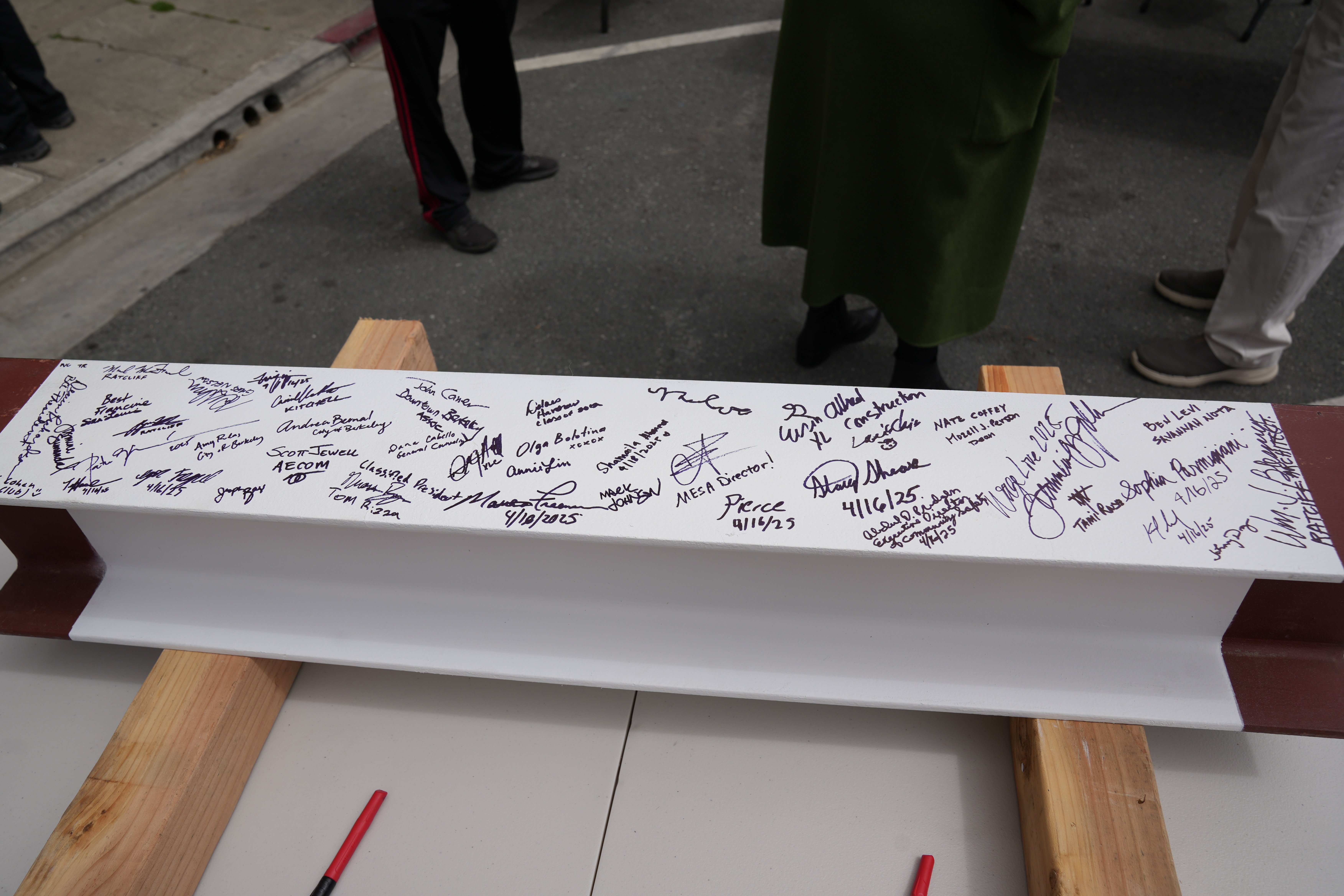 Berkeley City College celebrated a milestone achievement in the construction of its new Berkeley City College West campus. One year after breaking ground on the project, the superstructure of the six-story, 60,000 square foot academic and administration building reached its highest point. To mark the occasion, Berkeley City College and Peralta Community College District leaders, students, faculty, and staff joined its construction partners Kitchell, XL Construction, and Ratcliff, and city leaders and community partners in signing a ceremonial beam.
