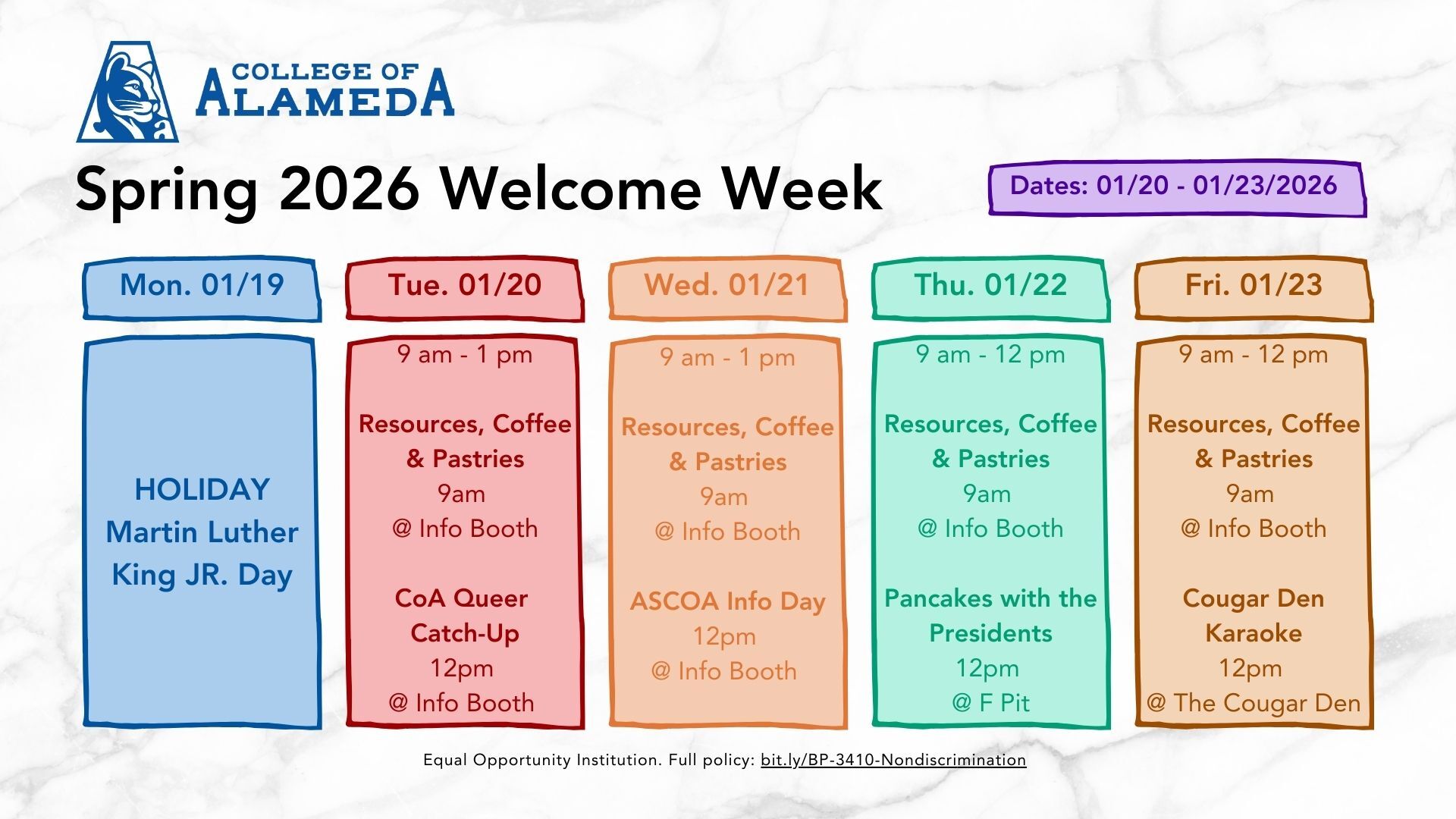 Join us for Welcome Week at College of Alameda and get connected to campus resources, student leadership opportunities, and support services – plus free food each day!